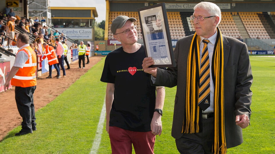 In a surprise presentation, Cambridge United chairman Dave Doggett gave Andrew a fitting memento – a dummy front page of a 1970s United programme.