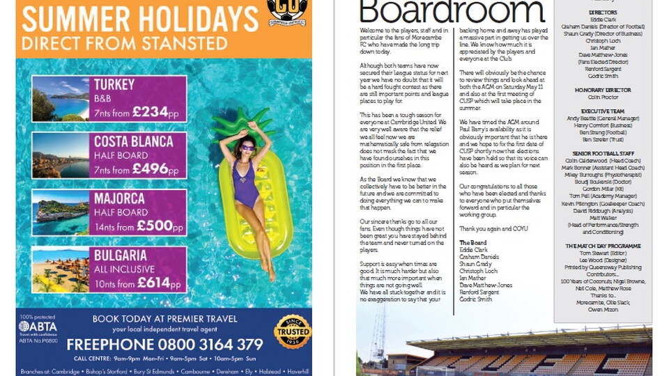 Ahead today’s final home match day of the season at the Abbey Stadium against Morecambe, enjoy a sneak preview of the match day programme and the “FROM THE BOARDROOM” feature here.