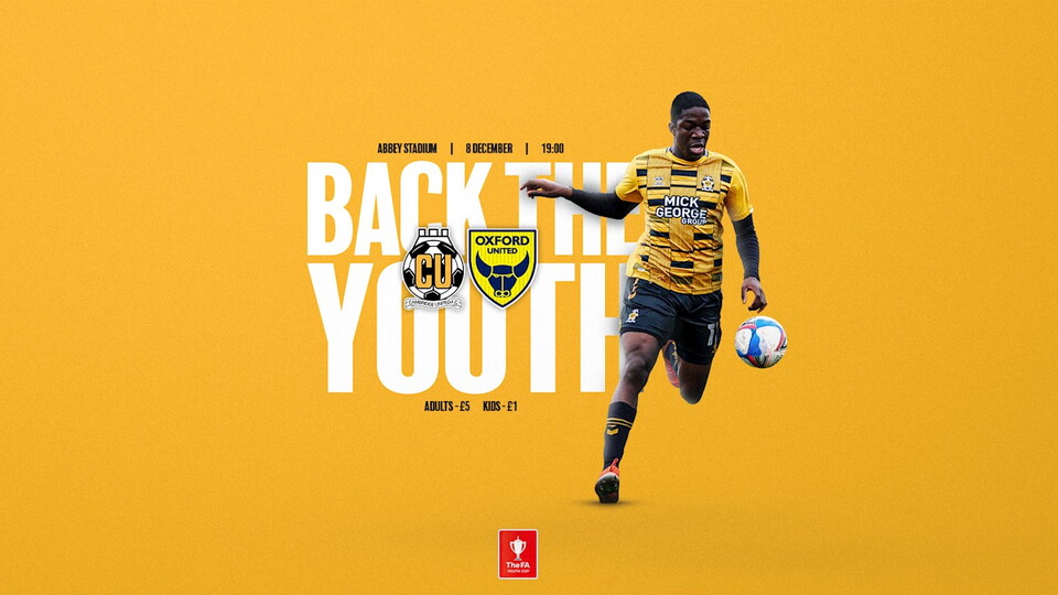 Cambridge United's U18s are playing at the Abbey Stadium on Wednesday 8th December in the FA Youth Cup...