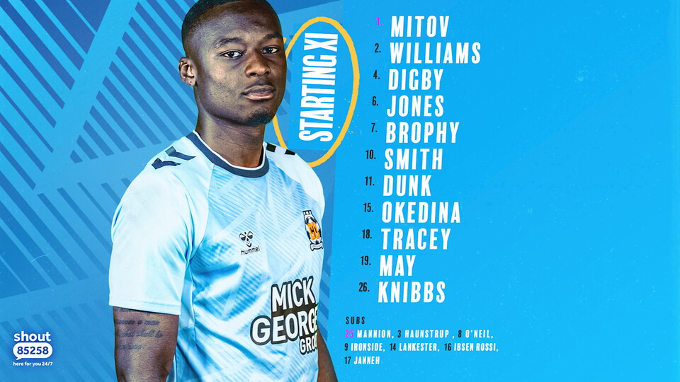 Following his minor injury, George Williams returns to the starting eleven, while Harrison Dunk, James Brophy and Adam May all come in, seeing Brandon Haunstrup, Greg Taylor, Liam O'Neil and Joe Ironside make way.
