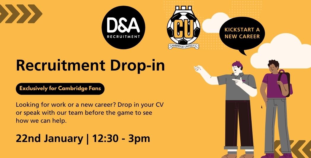 Our partners D&A Recruitment are holding a Recruitment Drop-in at the Newmarket Road End Car Park from 12:30pm. U's fans can benefit from being able to get career advice from their experienced team, without having to go out of their way during the week.