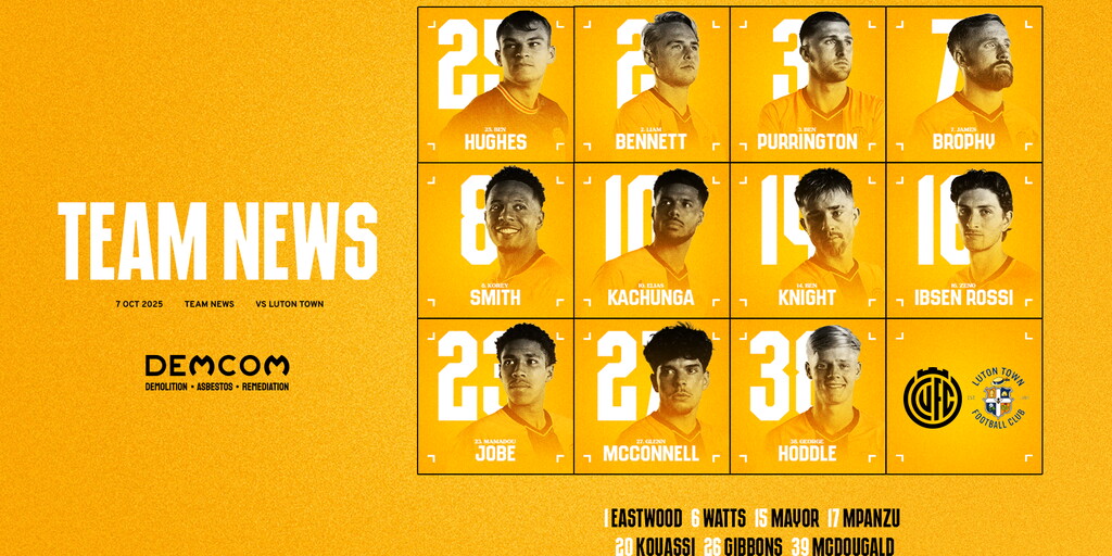 Ten changes have been made following Saturday’s win over Crawley, with James Brophy the only player to retain his place in the side. Ben Hughes starts between the sticks, making his first appearance for the club, while 16-year-old first-year scholar Lohan McDougald earns a place on the bench.