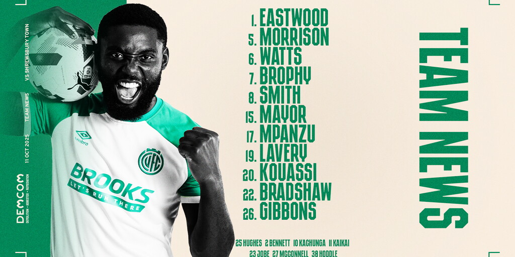 - Starting XI: Eastwood, Morrison, Watts, Brophy, Smith, Mayor, Mpanzu, Lavery, Kouassi, Bradshaw, Gibbons